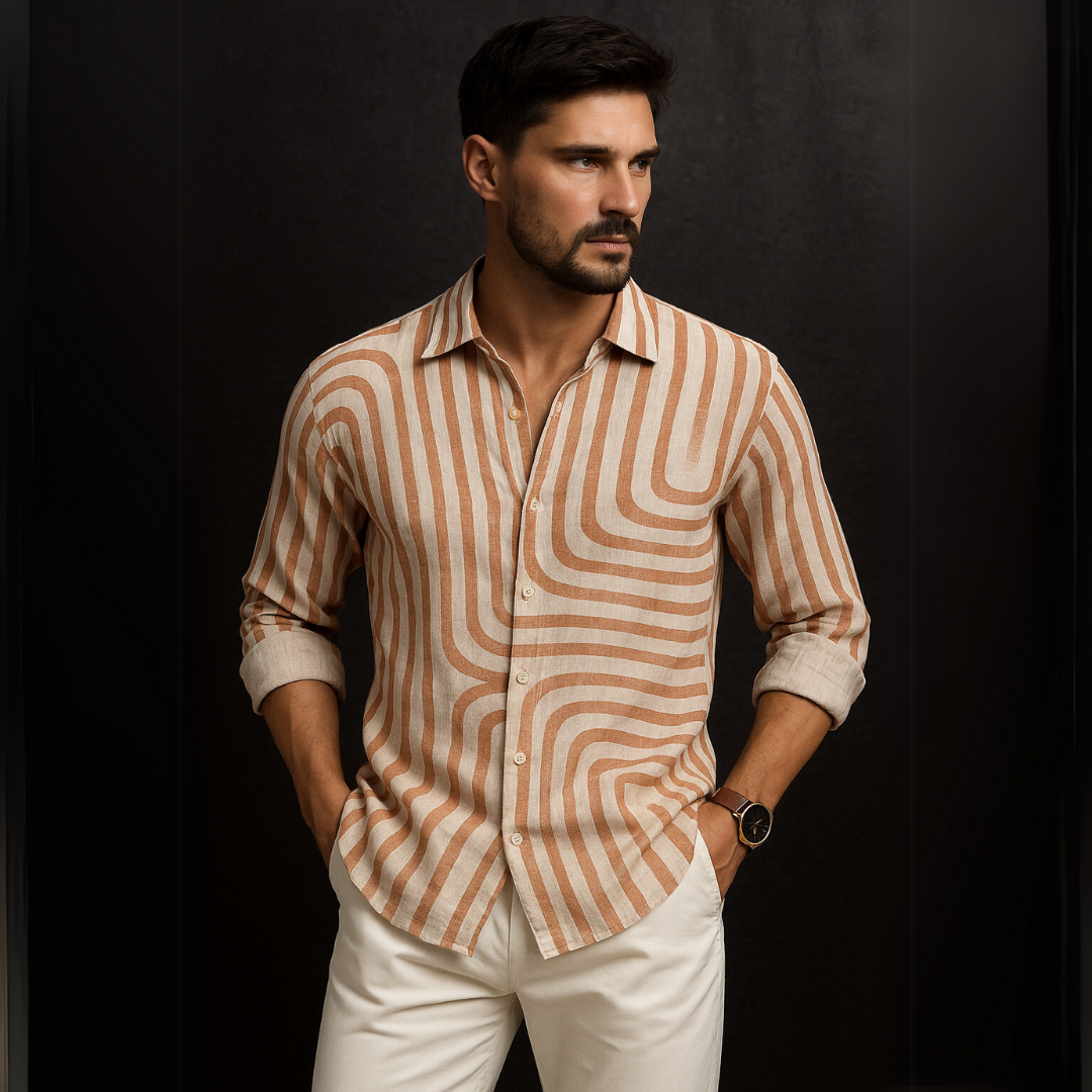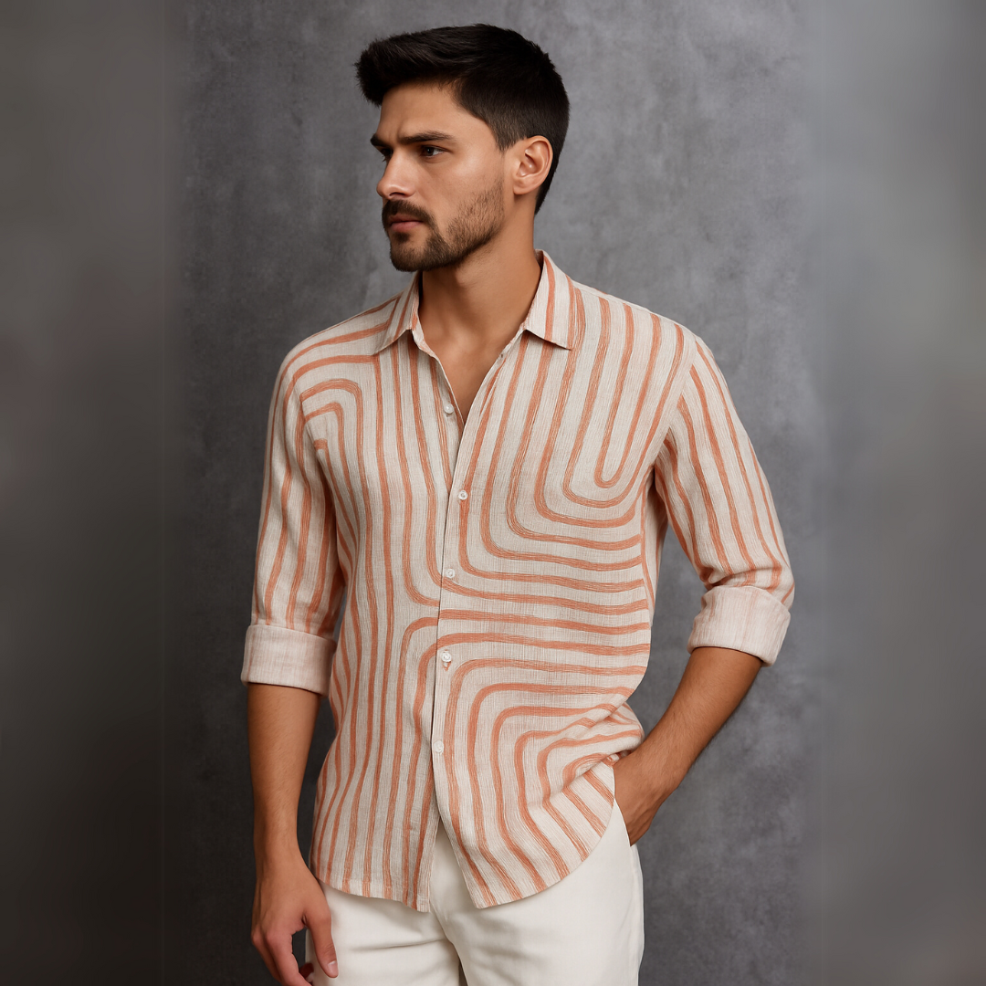 Make a striking yet effortless impression with the Amber Contour shirt — a perfect blend of modern artistry and timeless appeal. The warm, earthy tones and soft curve pattern create a visually dynamic look, while the premium fabric ensures comfort in every wear. Full sleeves and a sleek cut complete this elegant piece that seamlessly transitions from casual charm to refined elegance.