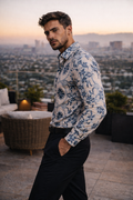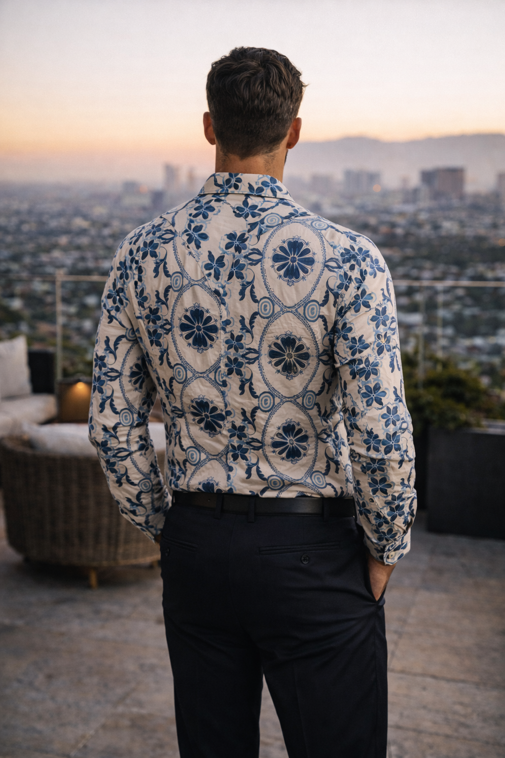 A statement printed shirt featuring an all-over floral motif in rich blue tones set against a light base. Designed to feel bold yet refined, this piece brings together intricate patterning and a versatile silhouette that’s easy to dress up or down.