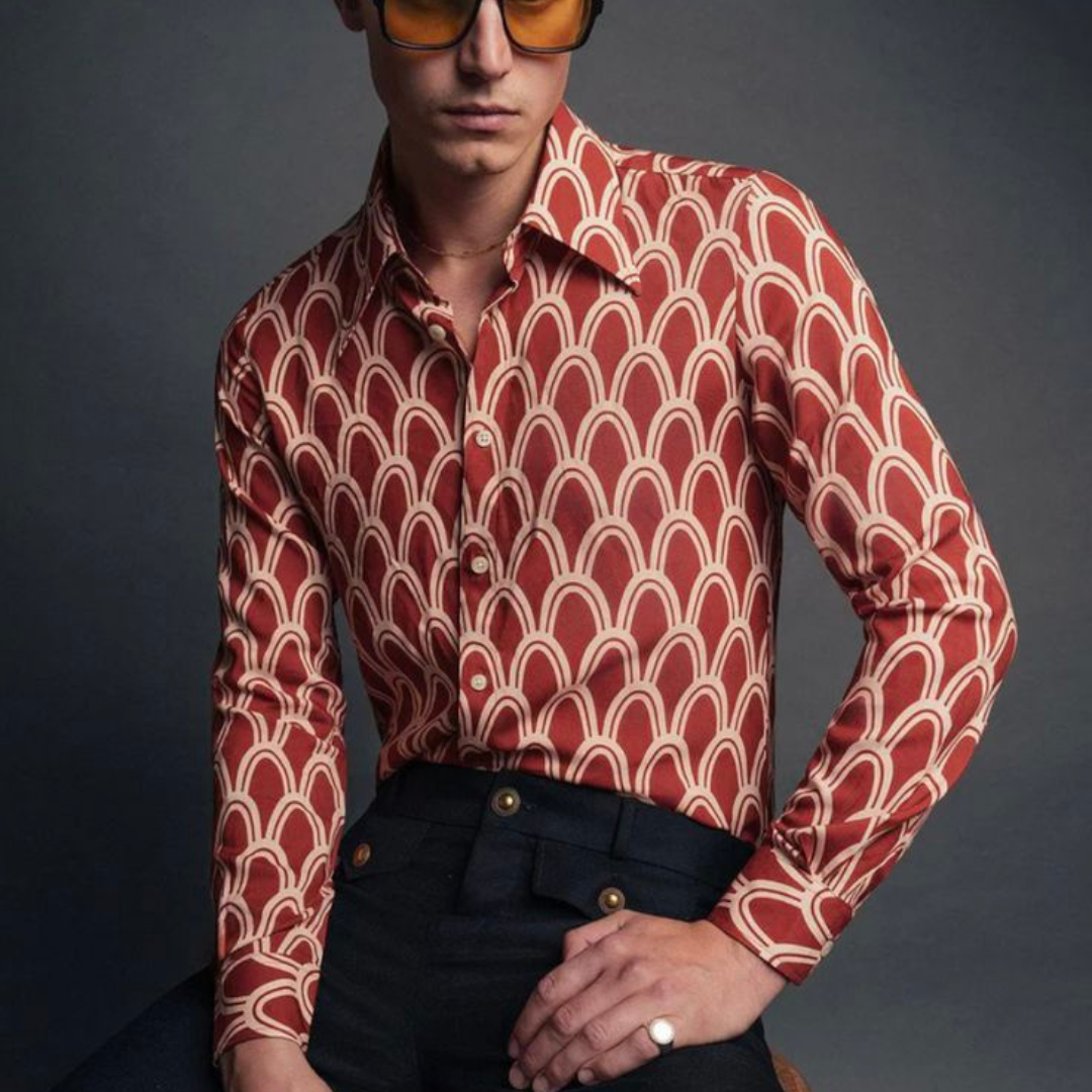 Step into timeless fashion with this LEHAR shirt, designed in rich rust hues that capture a vintage yet modern appeal. The premium fabric adds a soft sheen and breathable comfort, while the bold geometric arches make it a standout piece. With its full sleeves and front button closure, this shirt combines effortless style with a polished finish.
