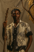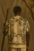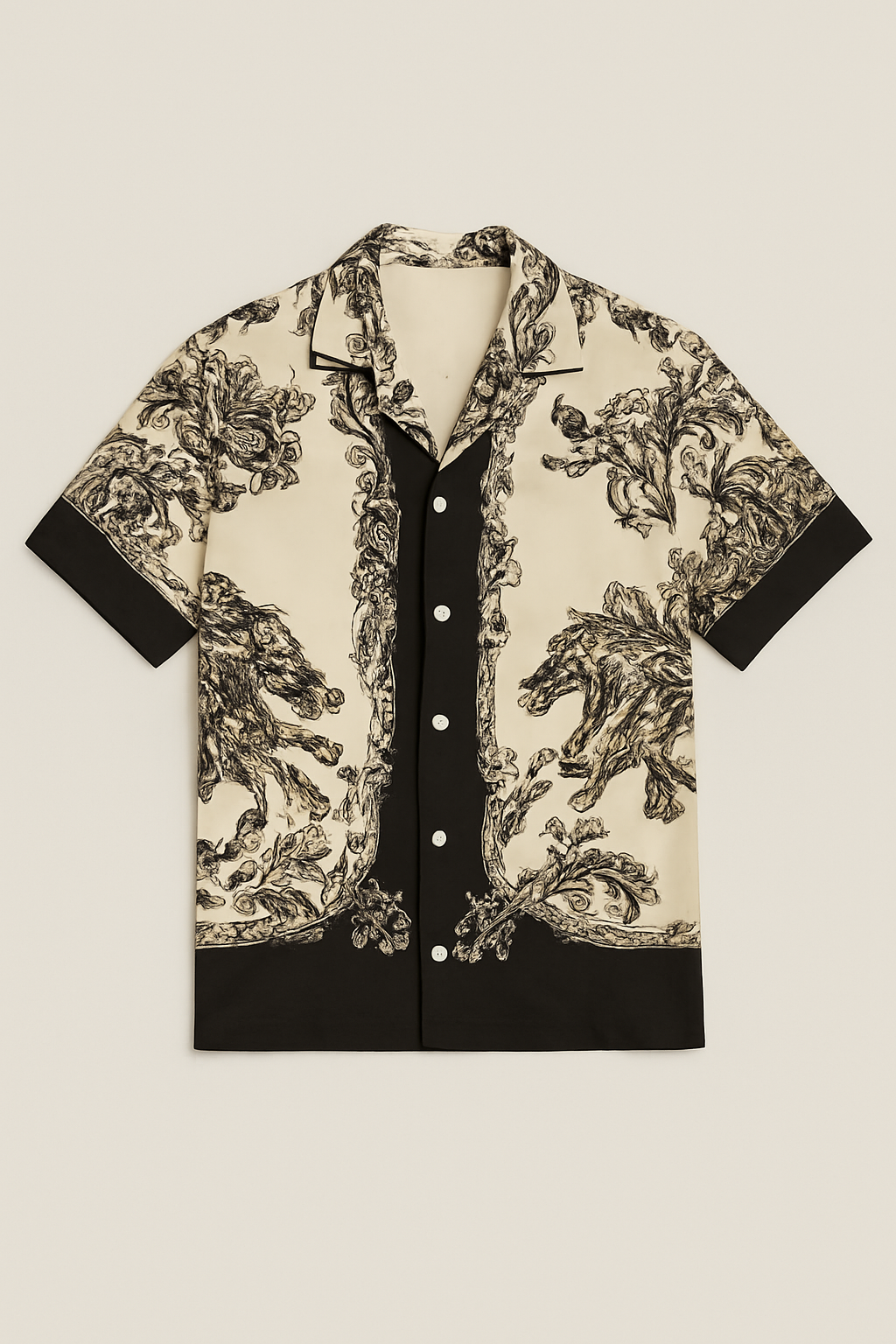 Step into an aura of modern royalty with this statement shirt, where artistry meets fashion. The shirt’s baroque-inspired illustrations of tigers, serpents, and mythical figures weave a story of power and elegance, all on a canvas of satin-silk that flows with effortless grace. With its striking dual-tone palette and refined tailoring, this piece is designed for the man who dares to be different — a wearable masterpiece that commands attention.